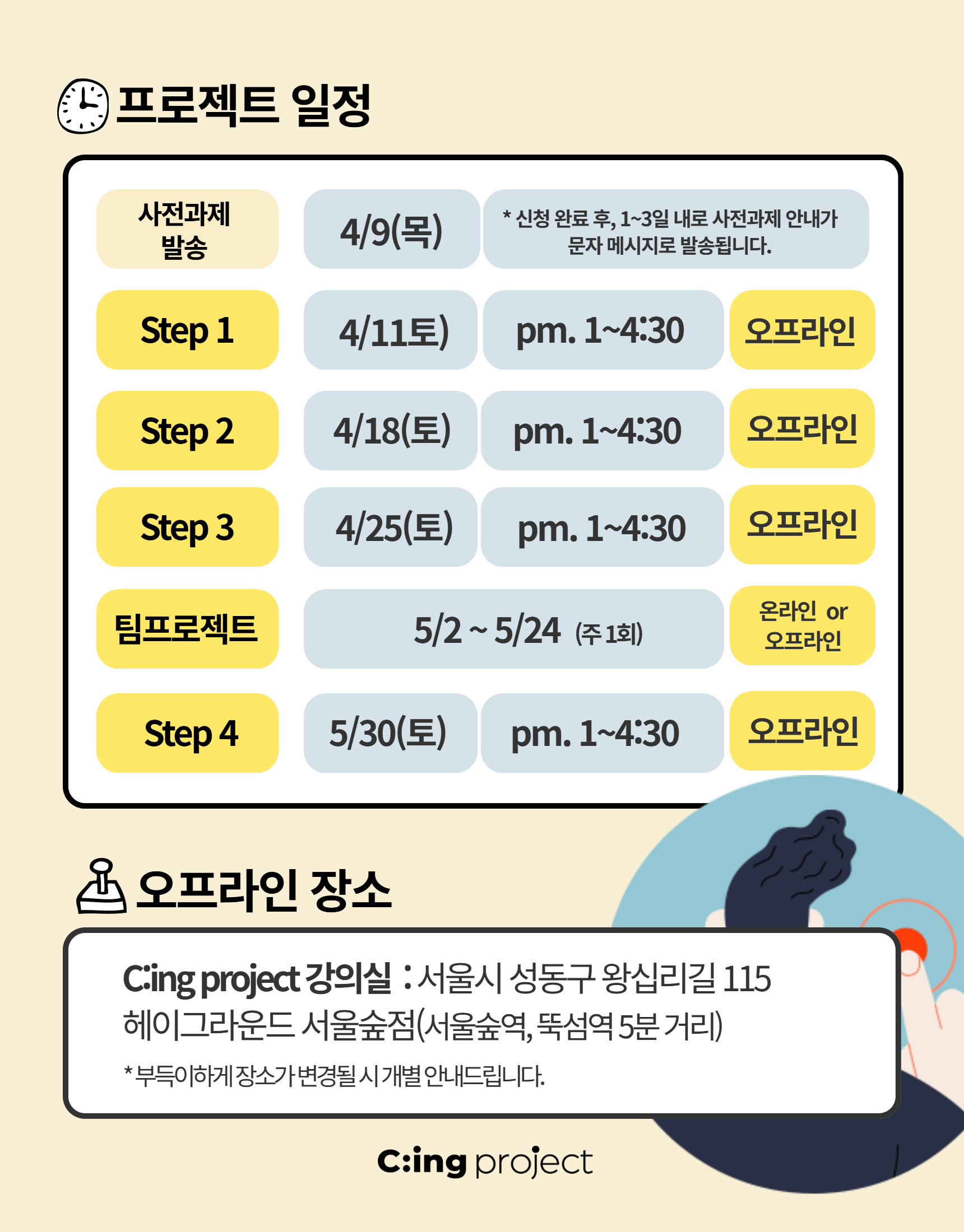 [공지] 아래는 4월 프로젝트 일정 안내입니다. 먼저, 아이덴티티 디자인 프로젝트의 진행방식과 커리큘럼을 아래의 링크를 클릭하여 확인해주세요👇