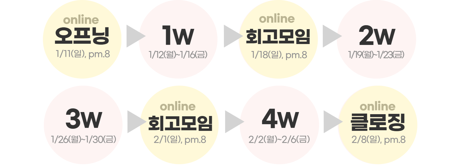 - 내 삶의 방향성을 기준으로 4주간 달성해보고 싶은 목표를 생각해본 후, 모임에 참여 합니다. 서로의 목표를 공유한 후, 피드백을 주고 받으며 매주 어떻게 실행해나갈지 플랜을 짜봅니다 (*4주간 달성해보고 싶은 목표는 프로젝트를 진행하며 수정, 변경되어도 괜찮습니다)